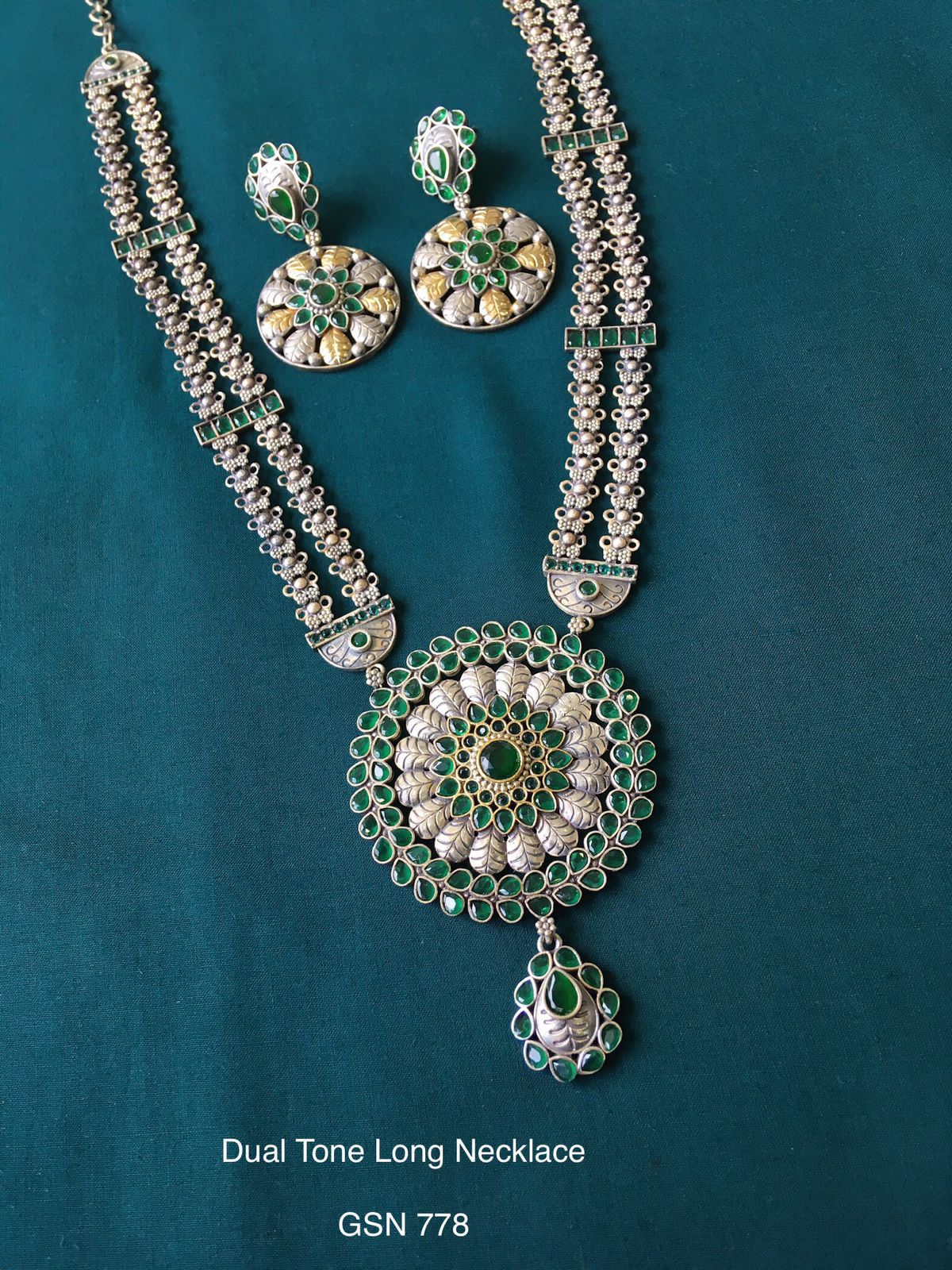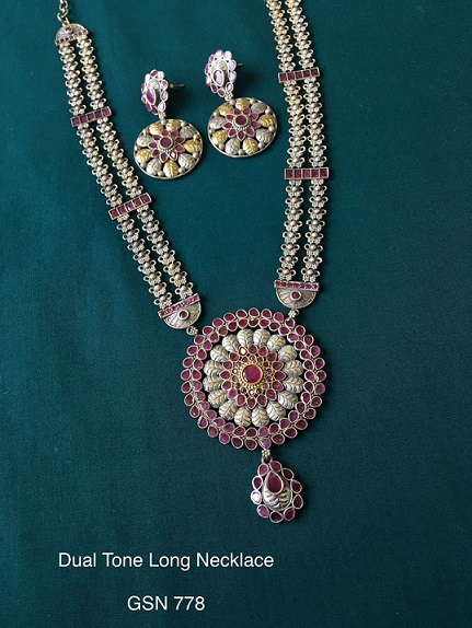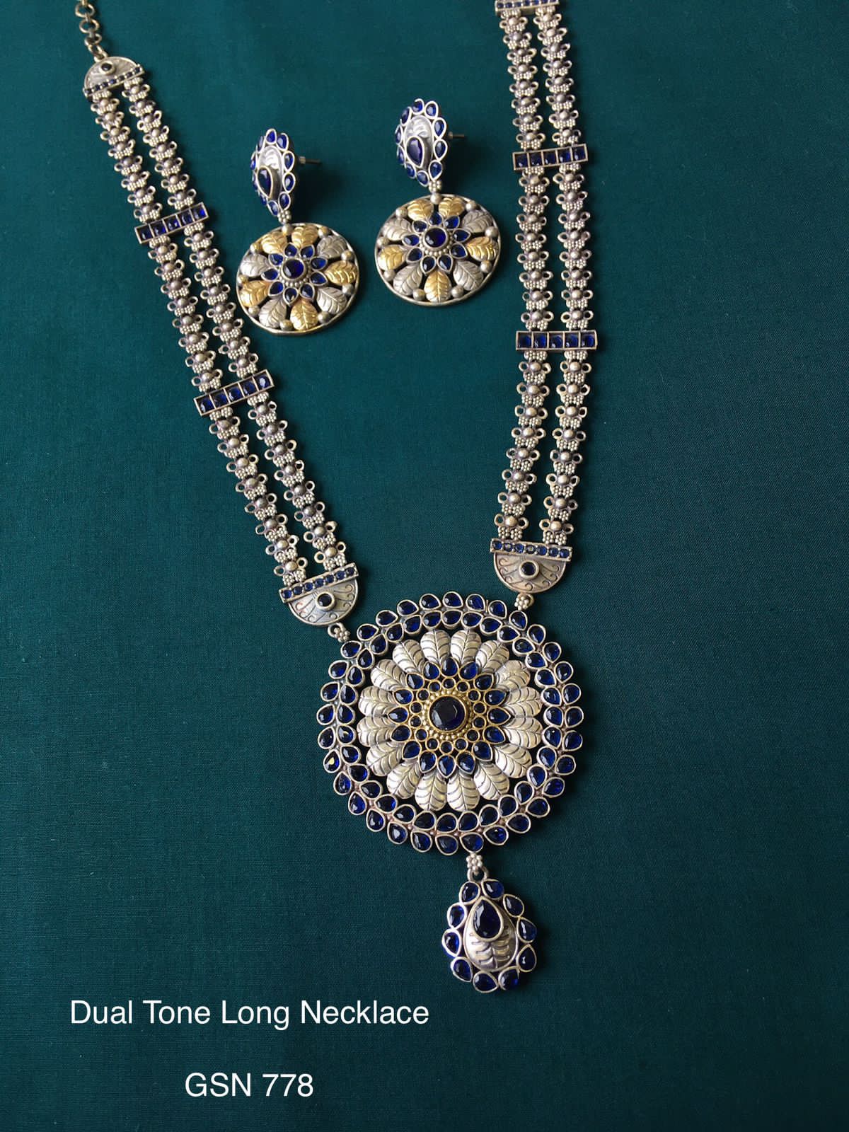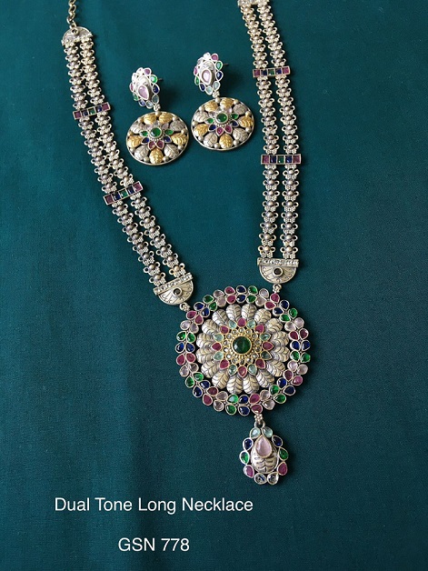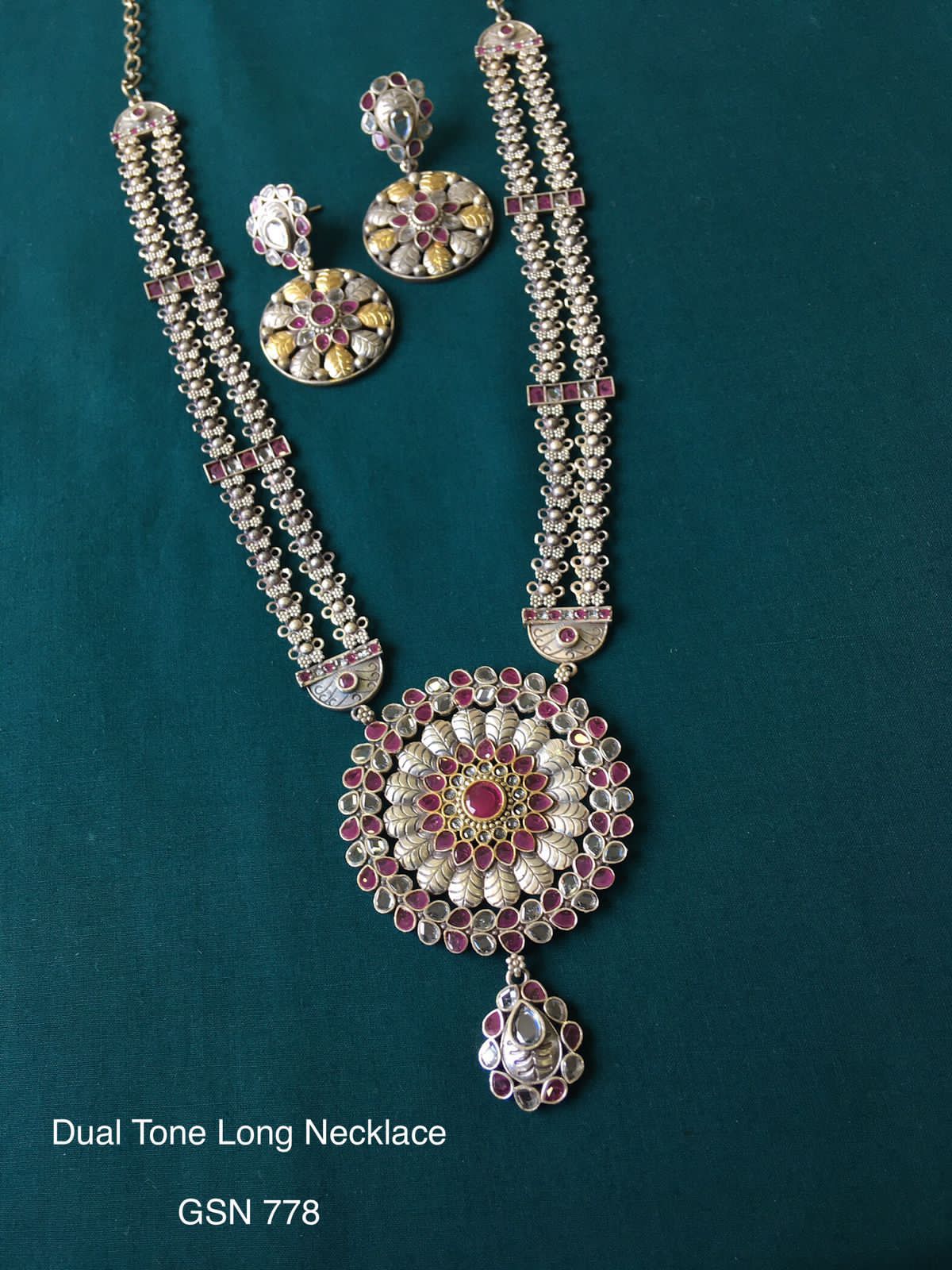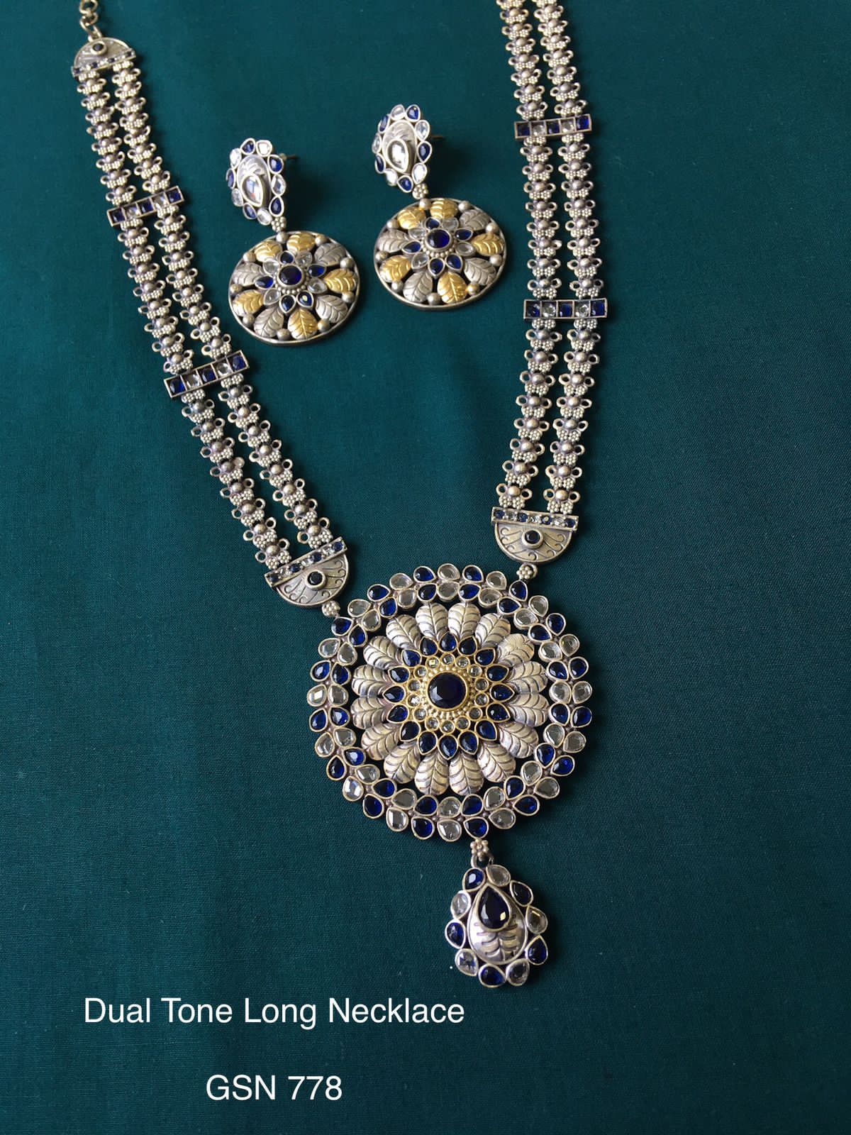 Description : Add a beautiful touch to your look with this unique handcrafted two-tone long necklace featuring intricate detailing. It is the perfect accessory for any special occasion or just to add an elegant touch to your everyday look. Shop now and make a statement.